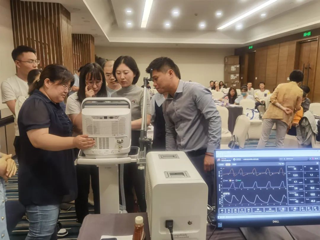 在进行机械通气实战课程时,天堰科技“模拟肺”模拟了“心衰、自主呼吸强但不稳定”、“重症肌无力”“哮喘伴意识不清醒”、“创伤后呼吸困难3天,确认为ARDS”等不同疾病状态下患者的呼吸运动变化,现场学员争先上手体验真实呼吸机对“模拟肺”虚拟病人进行救治,李晨主任与天堰技术人员配合不断调整虚拟病人病情,增加救治难度。呼吸治疗师袁吉腾老师则对学员的实操进行专业指导。此次实战课程达到了很好的授课效果,收获了现场学员的一致好评,天堰科技“模拟肺”被在场专家赞誉为“国货之光”。